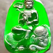 老坑料冰种俏阳绿文殊菩萨 翡翠吊坠 冰透起光