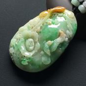 巧雕黄加绿鸟语花香 翡翠吊坠 尺寸:60-39-13.8毫米