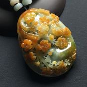 巧雕黄加绿鸟语花香 翡翠吊坠 尺寸:53-38-14.7毫米