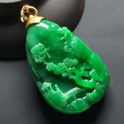 冰种满绿 大好河山翡翠吊坠 18k金扣 尺寸:49-33.5-11.8毫米