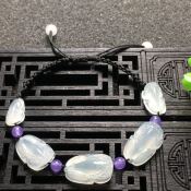 将翡翠玉手链对光察看,翡翠中有其他矿物颗